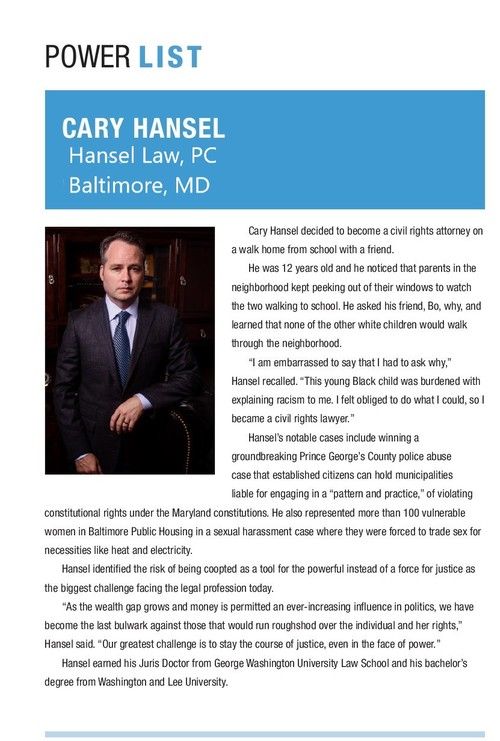 Cary Hansel and co-counsel Annie Hirsch were named Trial Lawyers of the Year for their work on behalf of over 100 victims in the Baltimore Public Housing, "sex for repairs" scandal. The Baltimore Sun called the settlement they obtained, “the largest in a sexual harassment case under the Fair Housing Act….”